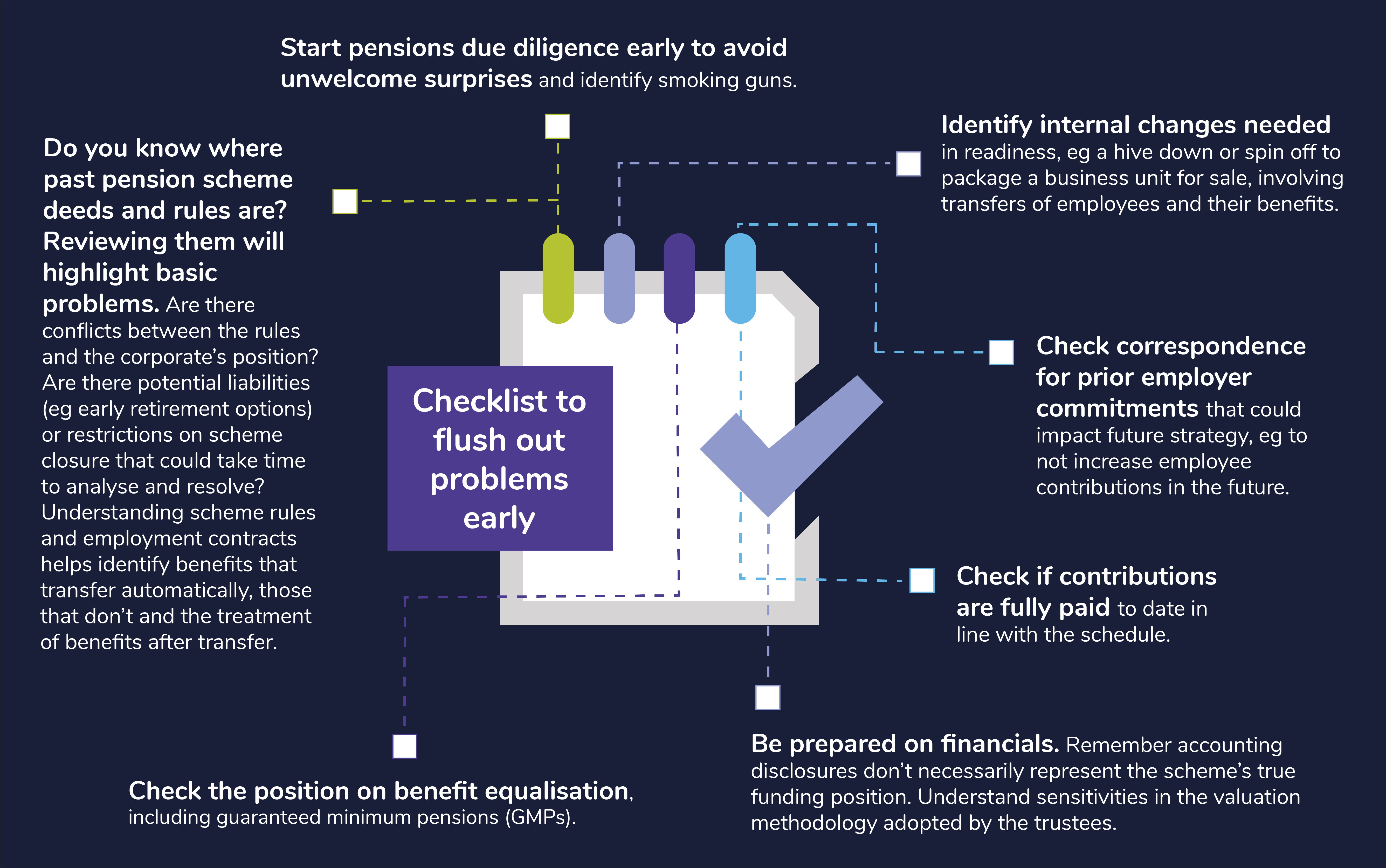 Multiple moving parts and competing interests are a feature of M&A activity, but all the more so when a pension is involved. By engaging early, the scheme’s trustees will be in a better position to understand what’s driving the transaction, ensure the interests of scheme members are appropriately protected and support the deal process.