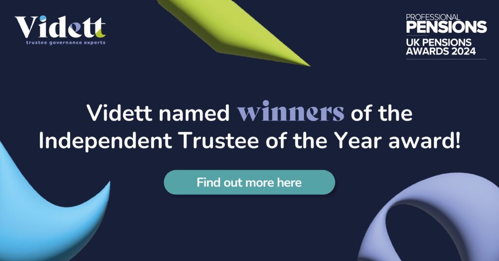 Last night we were once again named ‘Independent Trustee of the Year’ at the UK Pensions Awards 2025 gala dinner in London. Retaining the award from our 2024 win, it was all smiles with the accolade representing another fantastic win for the entire Vidett team. On reflection of the brilliant win, chief executive Wayne Phelan […]
